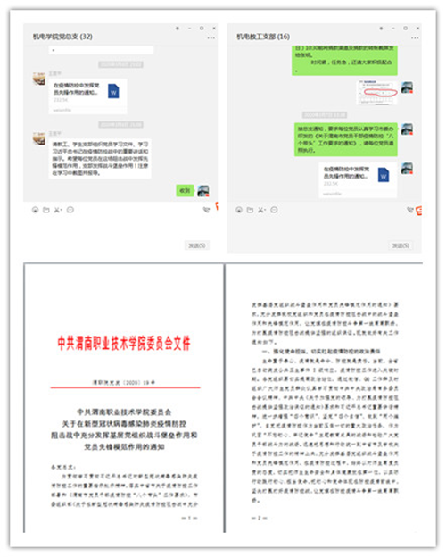 根据公司党委和机电党总支安排,2020年3月7日至3月11日,l9193永利教工支部书记李敏宁利用微信群,组织全体党员同志,在保证公司停课不停学,备好课、上好课的前提下,利用课余时间,学习19号文件,认真领会《关于渭南市党员干部疫情防控“八个带头”工作要求的通知》精神。
