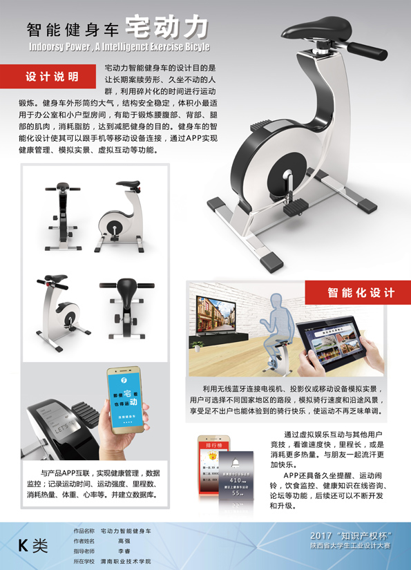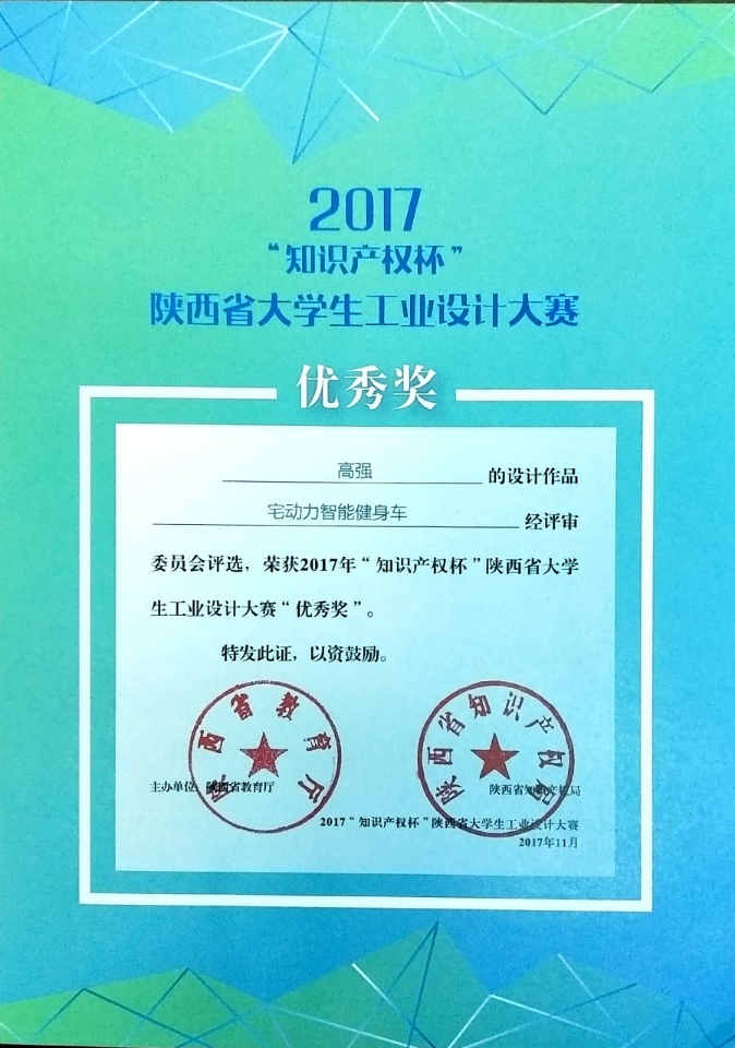 近日,陕西省教育厅和省知识产权局联合公布了2017年“知识产权杯”陕西省老员工工业设计大赛获奖名单,l9193永利计算机1602班员工高强的作品“宅动力智能健身车”获得大赛优秀奖,指导老师为l9193永利教师李睿。