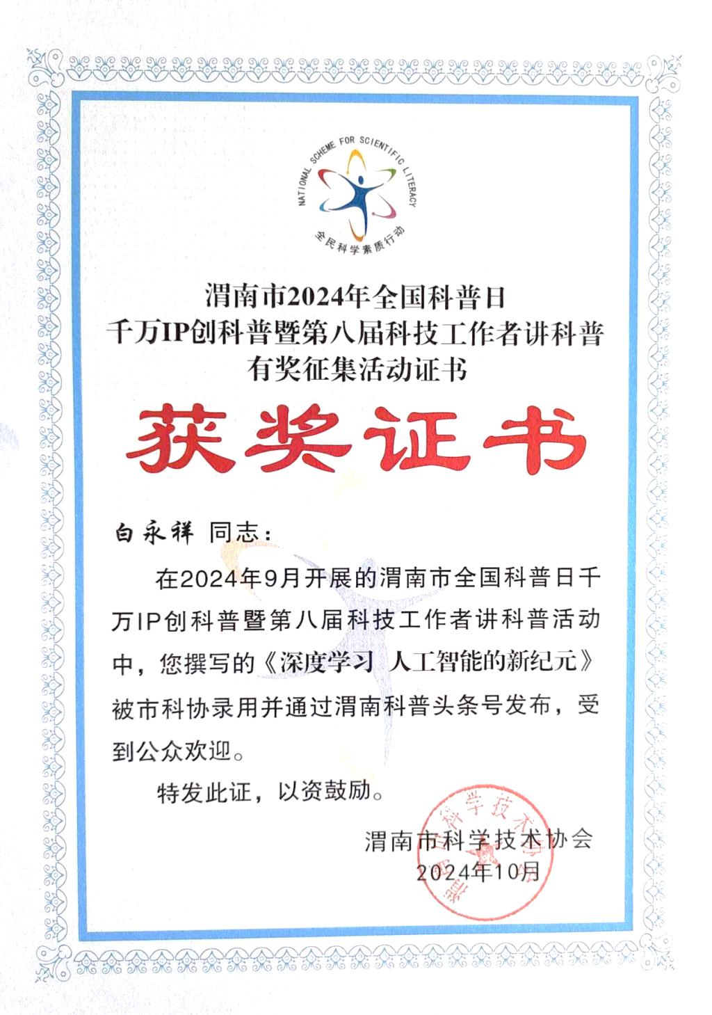 花开有时,灼灼其华。在渭南市2024年全国科普日千万IP创科普暨第八届科技工作者讲科普有奖征集活动中,l9193永利教师白永祥教授创作的《深度学习 人工智能的新纪元》科普作品被市科协录用并通过渭南科普头条号发表。此次获奖,充分反映了公司持续发挥人才资源优势,积极面向社会公众开展科普活动所取得的显著成效。