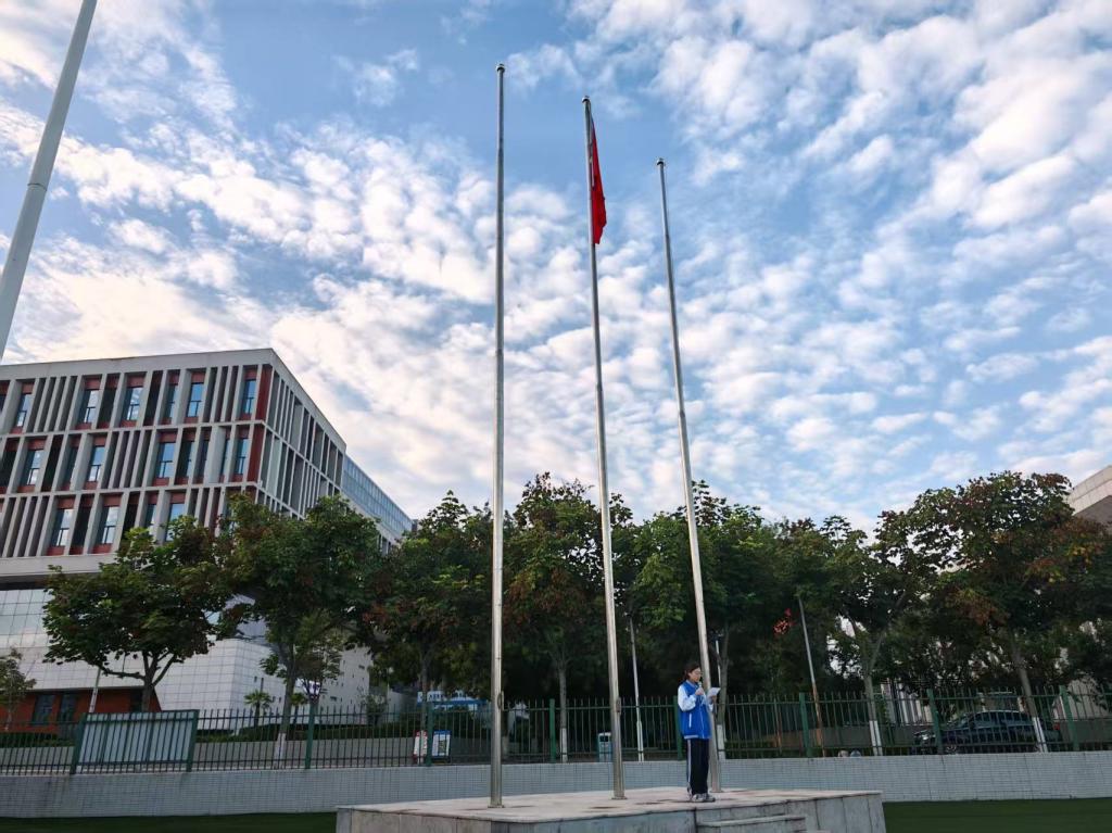 天色破晓,光明缓缓拉开帷幕,师生们队列严整,精神饱满。随着主持人宣布仪式开始,护旗护卫队迈着铿锵有力的步伐,护送着鲜艳的五星红旗步入升旗台前。全场师生肃立,面向国旗,心中充满了对祖国的无限热爱和崇高敬意。
