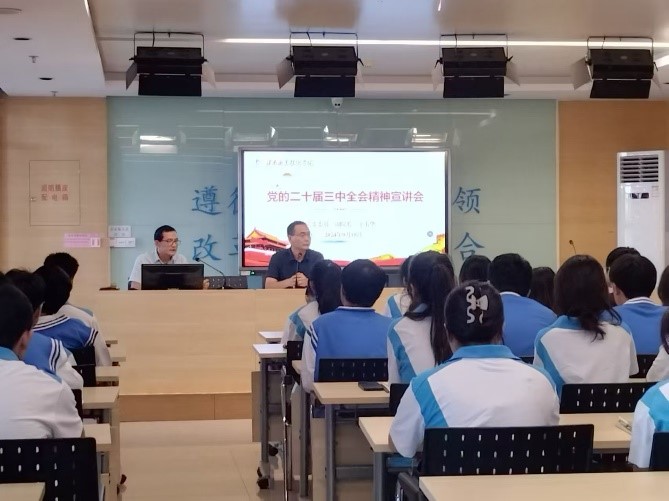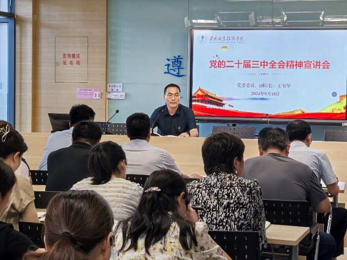 王韦华从党的二十届三中全会的重大意义、深化文化体制机制改革、健全保障和改善民生制度体系等三个方面,对党的二十届三中全会精神进行了深入的解读和阐释,使与会师生对全会精神有了更深刻的理解和认识。