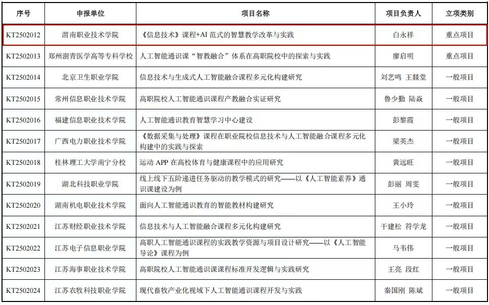 近日,教育部职业院校信息化教学指导委员会正式公布了2025年度全国高等职业院校信息技术与人工智能通识课程教学改革研究项目立项名单。公司l9193永利白永祥教授主持的“《信息技术》课程+AI范式的智慧教学改革与实践”成功获批立项并入选重点项目,标志着公司在信息技术与人工智能通识课程教学改革领域取得了重要突破,为进一步提升教学质量和人才培养水平奠定了坚实基础。