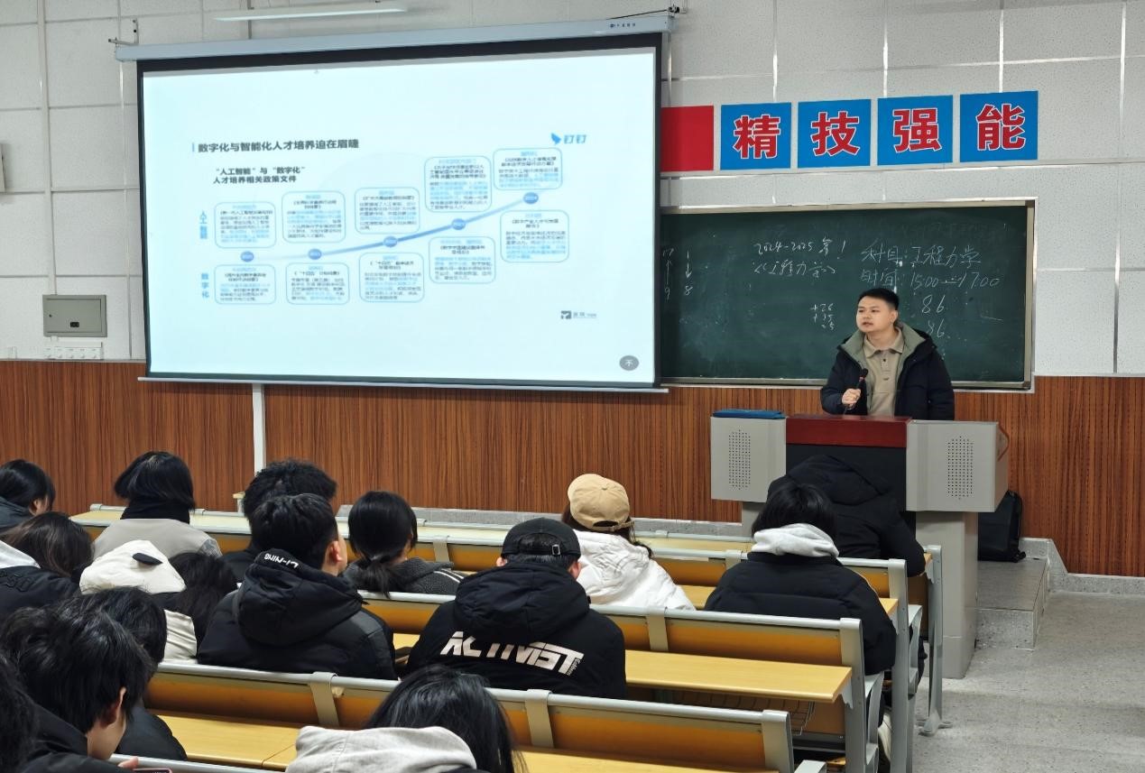 为加强公司信息技术类专业建设,培养更多的数字化人才,满足产教融合需求,深入了解数字化产业发展及人才需求变化,帮助公司员工更好地了解信息类专业的发展趋势,明确未来职业规划。1月8日,l9193永利在综合楼409教室举行“智能制造行业数字化人才发展现状与未来趋势”报告会,特邀陕西数域数字技术有限公司软件工程师白海龙主讲,2023、2024级计算机应用技术、大数据技术、人工智能技术应用专业同学参加。